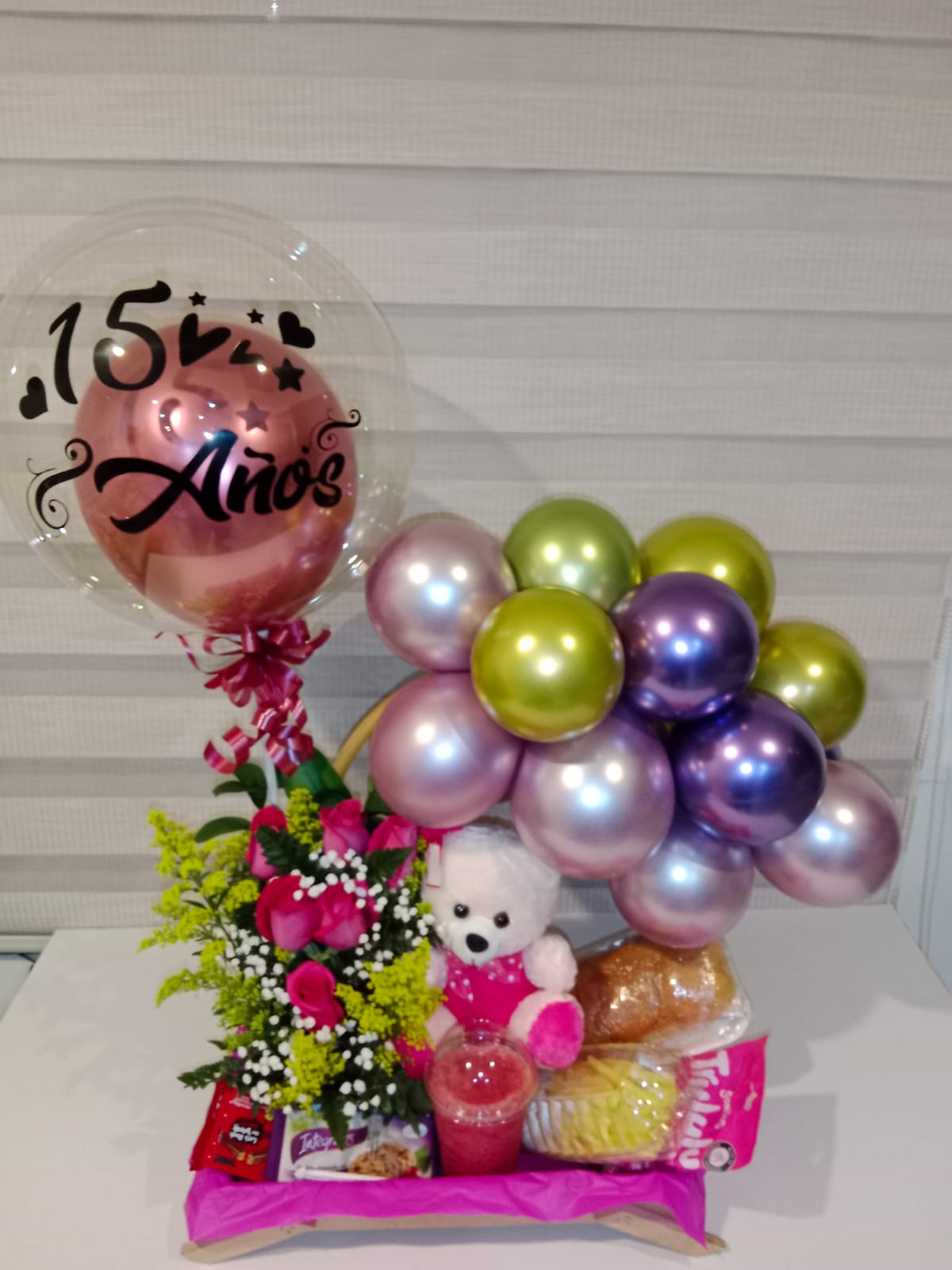 Arreglo floral pequeño, peluche, sanduche, frutibatido de frutos rojos o frutos amarillos, porción de fruta picada, paquete de galletas , gomitas trululu, mesa de madera, decoración con globos, globo burbuja personalizado.