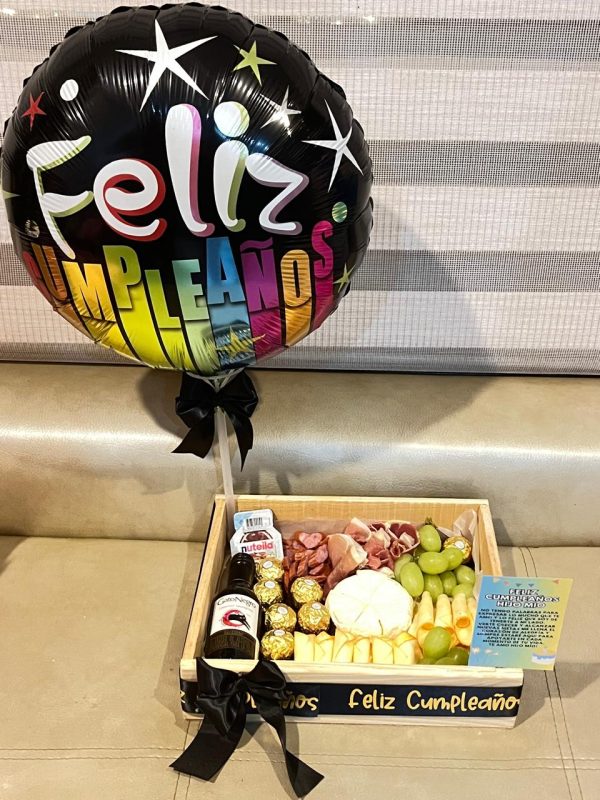 Contiene: Tabla de quesos semimadurados, salami, jamón serrano, vino gato negro mini, 6 chocolates ferrero, uvas, globo de acuerdo a la ocasión, tarjeta personalizada