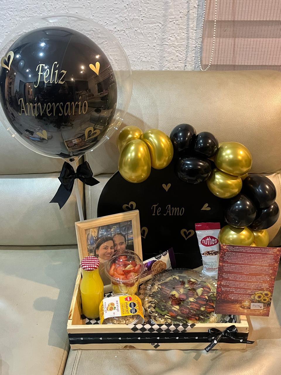 Contiene: Waffle, paquete de mani, porción de fruta, jugo de naranja, parfait, galletas, foto con portaretraro, caja de madera con decoración de globos, globo burbuja personalizado, tarjeta personalizada.