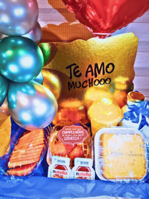 Contiene: Foto con marco de madera, mug personalizado, sanduche grande, ferrero por 4, tarro con maní, bandeja con waffle, gomas y fruta, tarro de leche, bolsa de capuccino, jugo, manzana, caja de madera, decoración con globos de acuerdo a la ocasión, tarjeta personalizada.