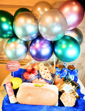 Waffle, sanduche pequeño, porción de fruta picada, frutibatido, tarro con leche, bolsa cafe capuchino, caja de madera con globo para la ocasión y tarjeta personalizada.