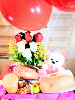 Contiene: Bandeja de gomas y maní, waffle con fruta y chocolate, dos alpinitos, mini ramito, porción de fruta picada, bouquet de flores, decoración en globos con globo oso, caja de madera.